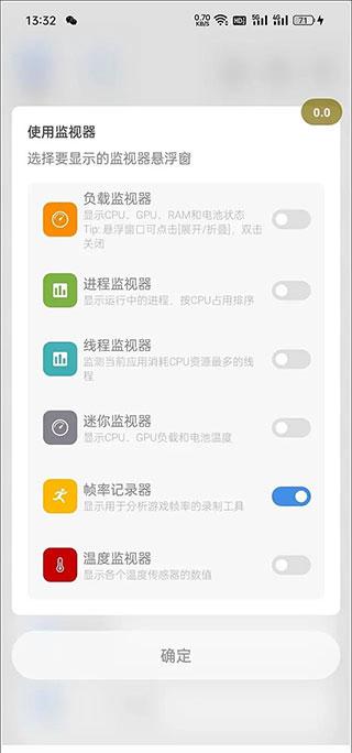 在监视器界面,我们可以看到很多监视功能,但如果你只是希望监测游戏帧率,选择“帧率记录器”一项即可,此时会在手机屏幕上出现一个显示当前帧数的半透明圆形悬浮按钮。
