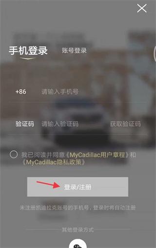 2、进入MycadillacAPP,选择相应的登录方式进行登录;