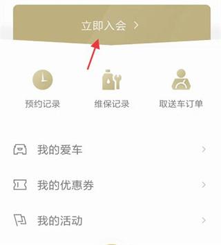 4、进入爱车,首先点击立即入会进入。进入在线入会,按照操作申请入会,点击下方的提交;