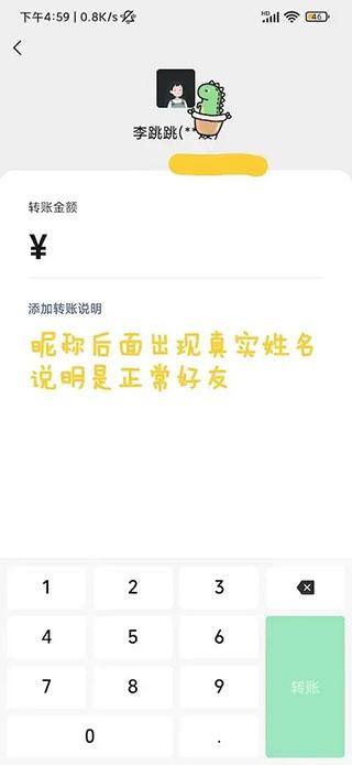 2、如果没有出现真实姓名,就需要用户进行“假转账”,进一步确认与好友之间的关系