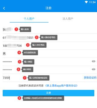 2、依次输入姓名、身份证号码、手机号码后点击选择性别,然后在输入密码(确认密码)和获取到的验证码,全部输入完成后点击最下方的蓝色“注册”按钮即可