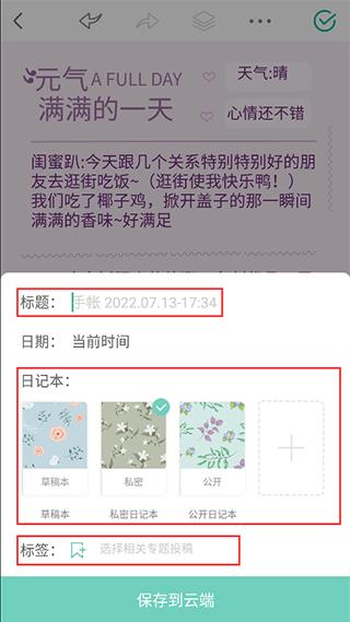 7、手帐完成后,点击右上角保存,填写好标题、日期、手帐本和标签等信息,一篇手帐就完成啦