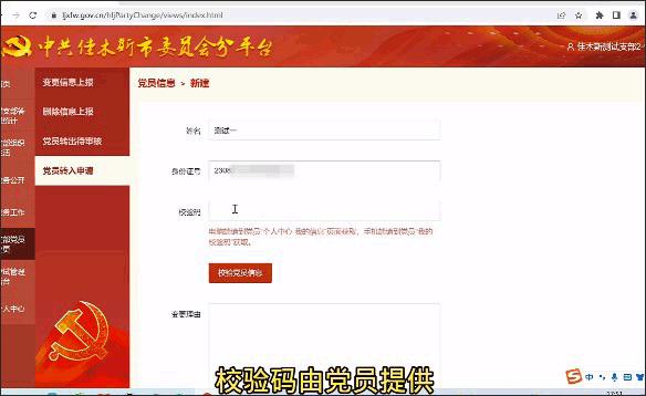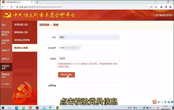 等输入好消息后需要校验码来验证党员信息,这个时候就需要我们自己进入到我们自己的个人中心内,进入到个人信息界面,将校验码提供给管理员,再由管理员输入校验码然后校验党员信息了。