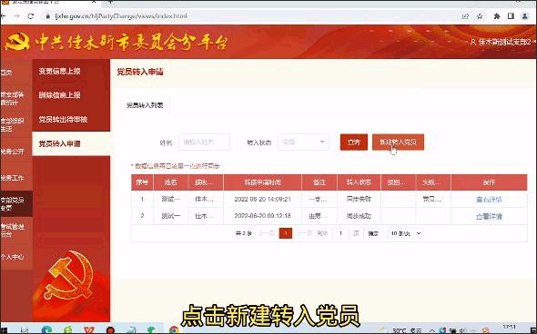 在党员转入申请界面内点击新建转入党员。