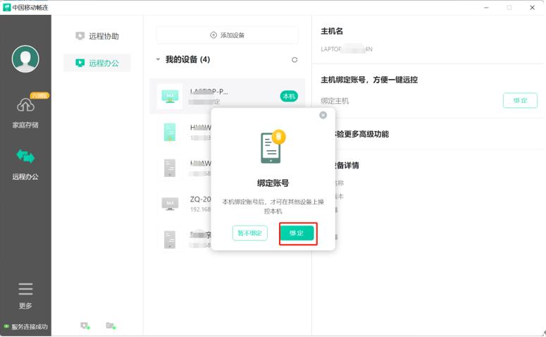 手机端、PC端添加设备成功且服务连接成功之后,会提示用户进行设备绑定,只有绑定的设备才可以在其他端的设备列表中展示,才可在其他端侧控制绑定的设备。如上图所示: