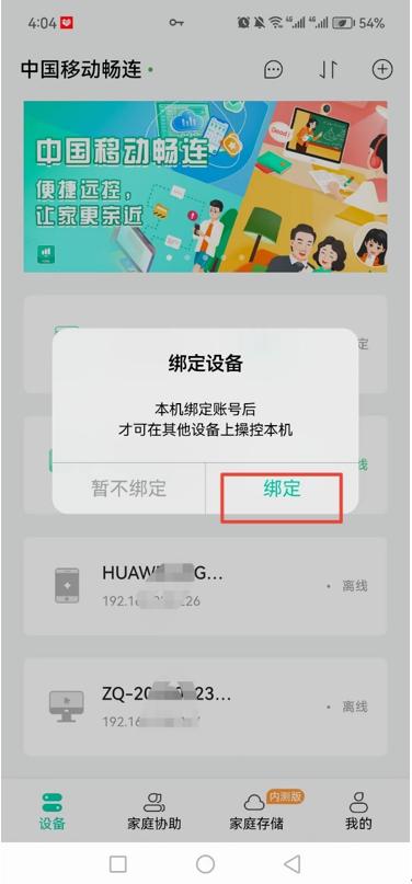 2、下载安装后绑定主机绑定账号;点击【手机】添加,在被控手机下载中国移动畅连