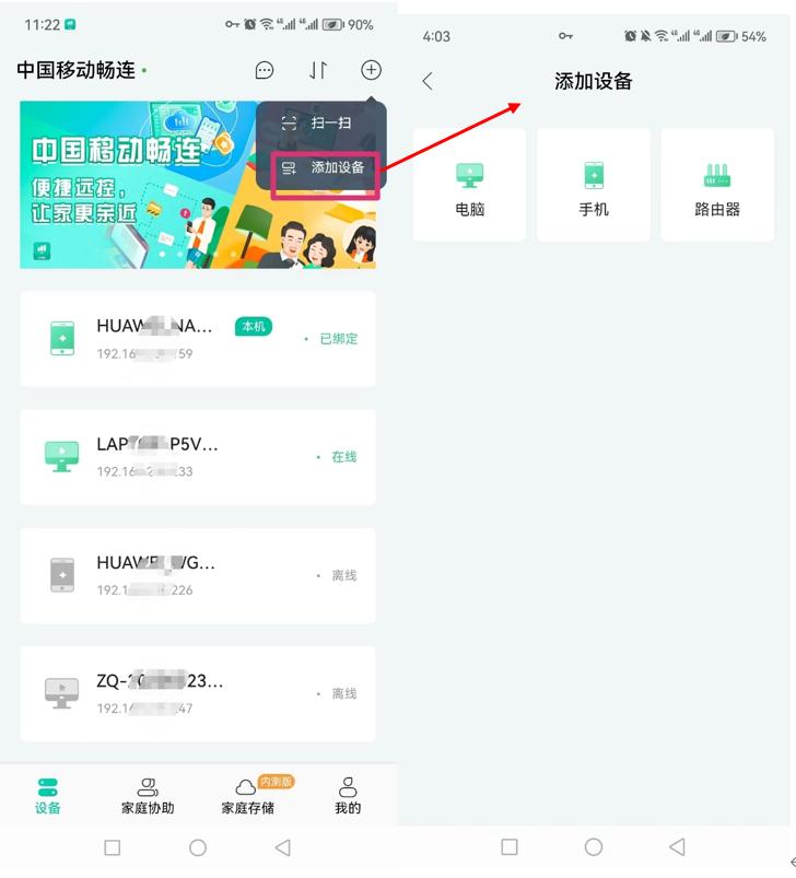 下载安装并登录中国移动畅连远程协作,点击设备tab页,进入设备界面。点击添加设备添加手机、电脑、路由器设备;