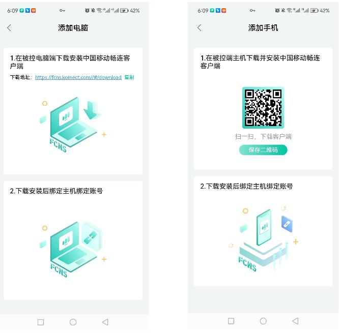 点击添加需要链接的电脑与手机,点击【电脑】添加,在被控电脑端下载中国移动畅连