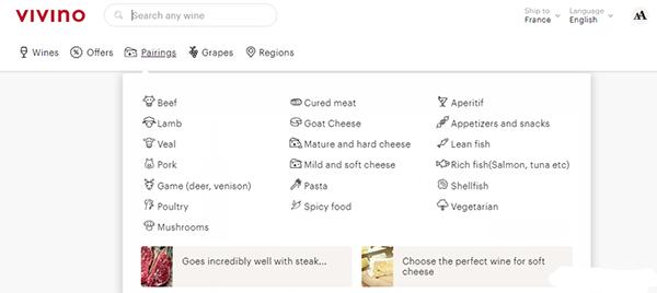 Vivino的推荐机制相比国内的电商平台更专业,更人性化。除了可以根据产区、品种、价位区间、评分、促销力度进行推荐外,还能根据配餐的食物进行推荐(类似于一个侍酒师的功能)。