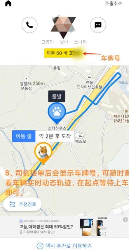 8、司机接单后会显示车牌号,可随时查看车辆实时动态轨迹,在起点等待上车即可。