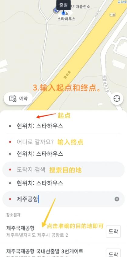 3、输入起点和终点。起点会自动定位,确认地点准确即可,도착지 검색 搜索目的地。