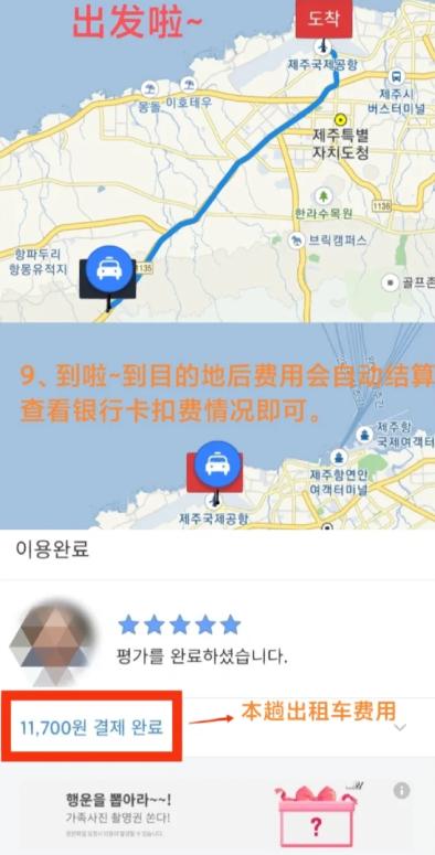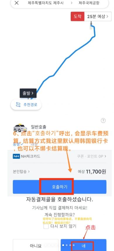 6、点击“호출하기”呼出,会显示车费预算,然后再点击“네”。结算方式我这里默认用韩国银行卡,也可以不绑卡结算哦。