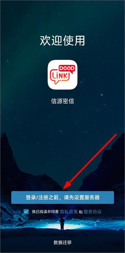 1、打开信源密信app,进入登录页面,用户可查看隐私政策、服雾协议和数据迁移,点击登录;
