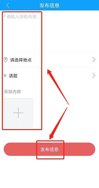 3、第三步:输入随手拍内容、选择地点、话题、添加图片,点击【发布信息】。
