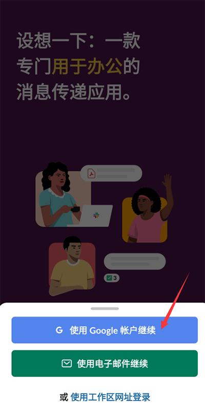 2、然后选择你的登录方式,可以选择谷歌账号、电子邮箱、工作区网址登录。小编以谷歌账号登录为例子。