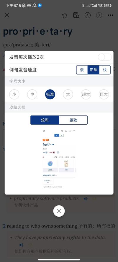 5、点击右上角的三个点按钮打开设置界面可以调整发音速度、设置APP皮肤、字号大小等。