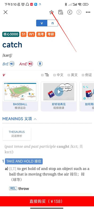 3、点进翻译界面可以详细的看到单词的音标、义项、例句、使用频率,点击左上角的五角星按钮还可以将其保存至生词本。(保存功能需要登录后才可使用)