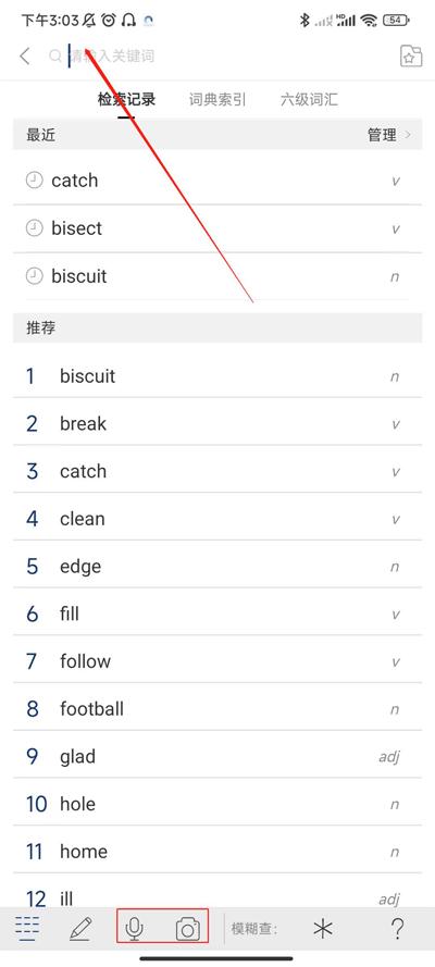 1、首先下载好软件,进入首页后在搜索栏的文字框里输入单词或者句子查询翻译点击麦克风或者相机按钮还可以进行语音输入或者拍照翻译。