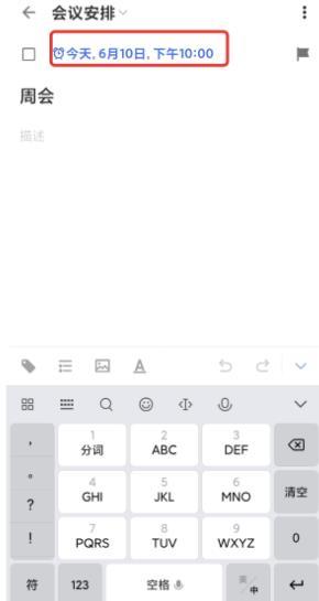 输入任务内容后, 点击日历图标旁边的 ‘自定义’, 在弹出的日历中直接选择到期日期。点亮日历下方的闹钟图标, 可以设置提醒时间。