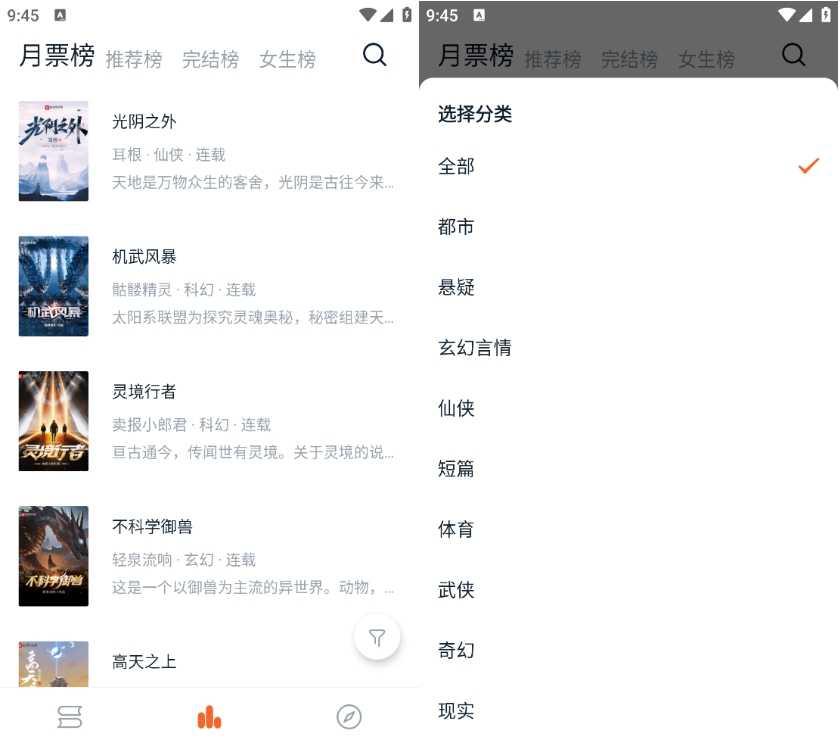第二页的书城有很多热门推荐,并且还能根据分类和频道进行筛选,这些推荐都能跟上潮流切实有效,算是个加分功能。