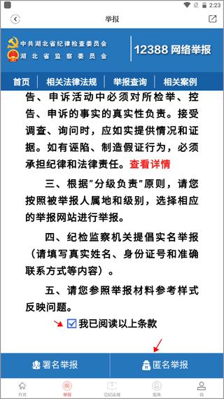 2、了解网上举报须知,勾选“我已阅读……”,点击下方的“匿名举报”。