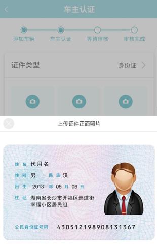 验证车辆成功后进入车主认证页面,首先选择证件类型,再上传对应的证件照片,如选择身份证,则需按照图片示例上传身份证正面照片、身份证反面照片、本人免冠照,上传成功后系统将自动识别出身份信息,不需您再手动填写。若识别出的信息有误,您可手动修改