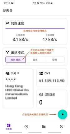 4、进入仪表盘界面,可以在此界面切换不同的代理模式,推荐使用默认的规则模式,即按配置文件规则自动分流网络数据。
