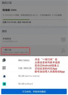 1、使用已经安装了Surfboard客户端的安卓本设备浏览器登录进入个人中心,在仪表盘页面下方的捷径区域找到“一键订阅”按钮,点击并选择“导入到Surfboard”选项。点击后会自动提示跳转到Surfboard客户端。