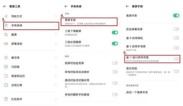 2、在手机「设置 > 便捷工具 > 手势体感 > 黑屏手势 > 打开画“心“进行咚咚传情开关」。
