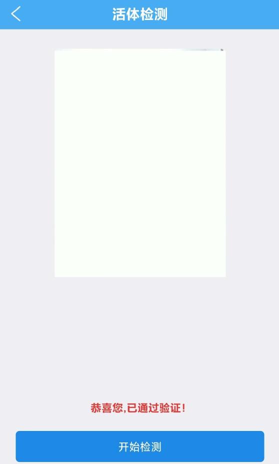 4、点击“开始检测”,将脸放到手机屏幕中出现的圈中,软件进行人脸比对。成功,下方会出现“恭喜您,已通过验证”。