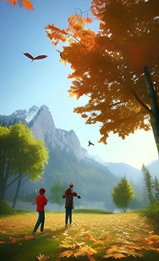 公园,游玩的人们,枫叶,小溪,蓝天,一群小鸟,远处有山