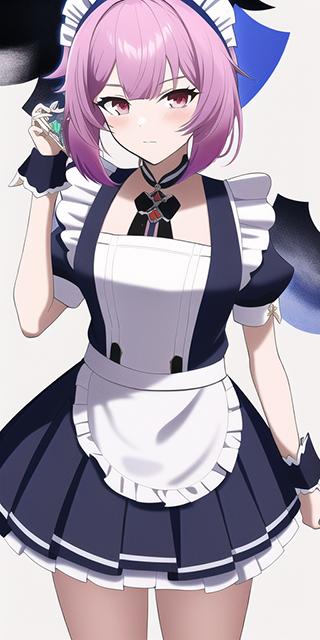 一位年轻的动漫女孩,女仆服装,比例图,高度详细的数字2D艺术,苗条的身体,粉红色和蓝色的短发,格兰蓝幻想,Azur Lane,Genshin Impact,命运大秩序,辛烷渲染。