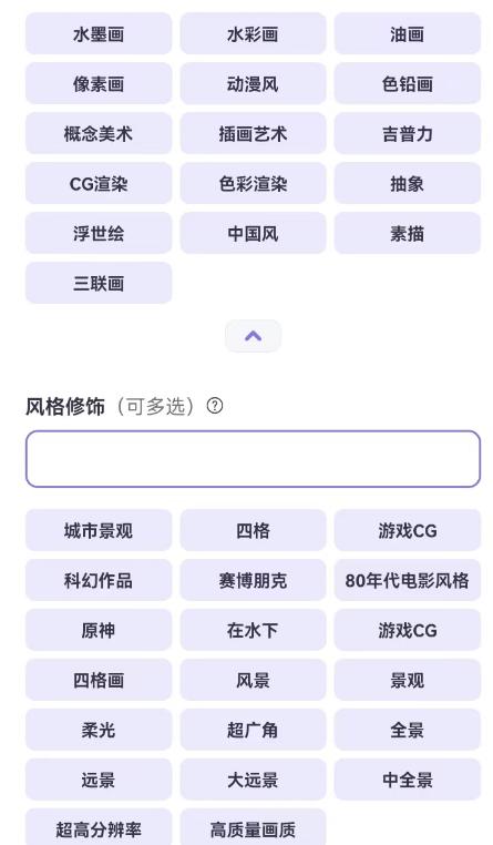 AI绘画平台也在操作界面提供了很多专业提示——【风格模型+高级设置】,对于刚接触 AI 艺术创作的用户可以先从平台指引的开始(请大胆组合它们,注意:平台仅仅是罗列了一些主流用词和风格,用户完全可以根据自己的认知大胆在文本描述框中写下自己喜欢的图画内容和各种细节修饰词),然后逐步自我拓宽自己的艺术认知和修养。