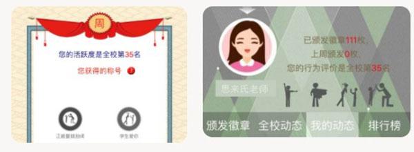 以周为时间单位,生成教师评价个人报告(仅个人能看到),根据颁发徽章数量、关注学生广度、校本徽章颁发数量、颁发徽章性质等四个指标为依据,让教师时刻了解自己的发章情况。