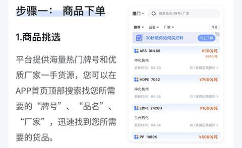1、在线交易:提供塑料原料线上交易服务,平台不赚取差价,一键下单,买卖更高效。