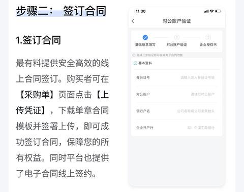 最有料app提供安全高效的线上合同签订。购买者可在采购单页面点击上传凭证,下载单章合同模板并签署上传,即可成功签订合同,保障您的所有权益。同时平台也提供了电子合同线上签约。