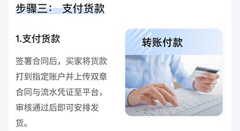 签署合同后,买家将货款打到指定账户并上传双章合同与流水凭证至平台,审核通过后即可安排发货。
