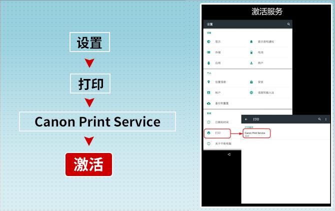 如果使用安装了Android 6或更低版本的移动终端:使用Canon Print Service进行打印时需将其激活。Canon Print Service安装后不会立即激活。