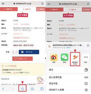 3、如果您使用的是iOS端时。当使用分类导航检索心仪网站时,会跳转至APP端默认浏览器Safari,您可在Safari中浏览商品。在您想购买的商品的详情页面中,点击“分享”按钮,在更多中打开“魔法集市Global"。点击“魔法集市Global"后,页面将自动跳转回Masadora的APP端,并为您自动解析该网页。