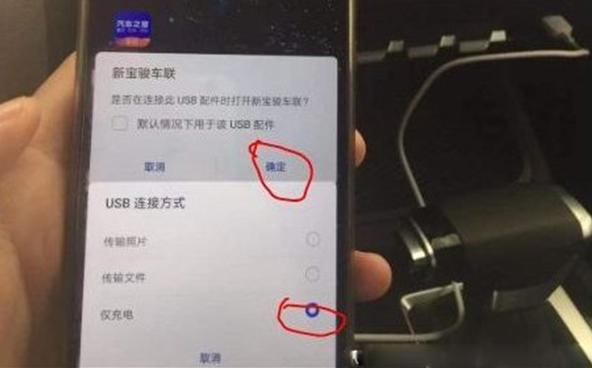 2、打开手机上的新宝骏APP,用数据线连接手机和车机,勾选“默认情况下用于该USB配件”的方框,并点击“确定”,后续弹出的USB连接方式提示框中,选择仅充电;