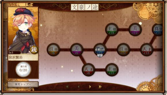 开花:消耗战斗中掉落的素材提升文豪的属性。也可解锁图书馆界面的新语音和新的衣装。