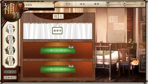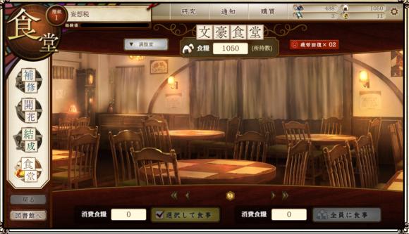 食堂:增加文豪的饱食度,以及使用道具进行疲劳回复。具体的料理会根据时间不同产生变化,给特定的文豪特定料理可以收集回想。