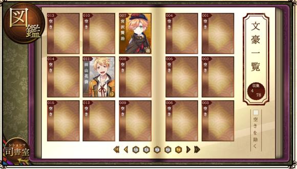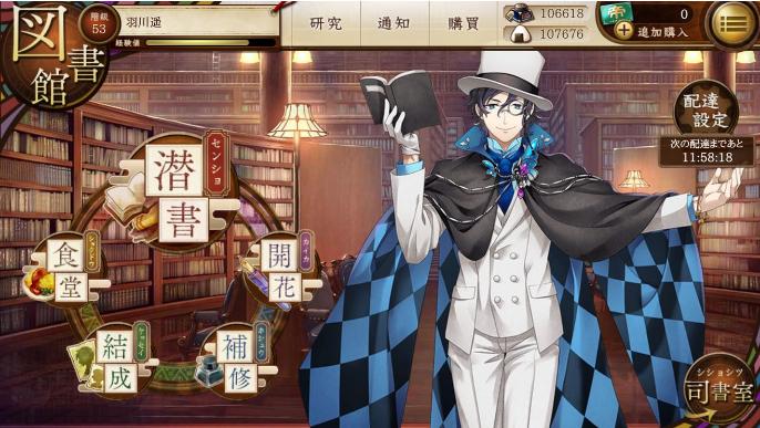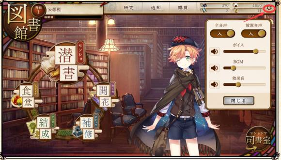 选完初始文豪开始进入图书馆界面,相当于刀男里的本丸,是游戏的开始界面,管理员的名字会自动使用DMM账号的名字,游戏里的按键和按钮都显示在画面上,点左上角可以隐藏按键,右边人物是助手,相当于刀男的近侍,近侍的更换后面司书室会讲,右上角的设置按钮可以调整声音大小,第一条ボイス是人物声音