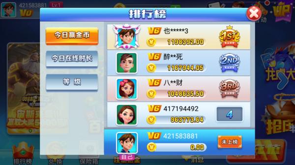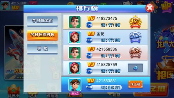 2、在排行榜界麵有今日贏金幣和今日在線時長兩種排行;