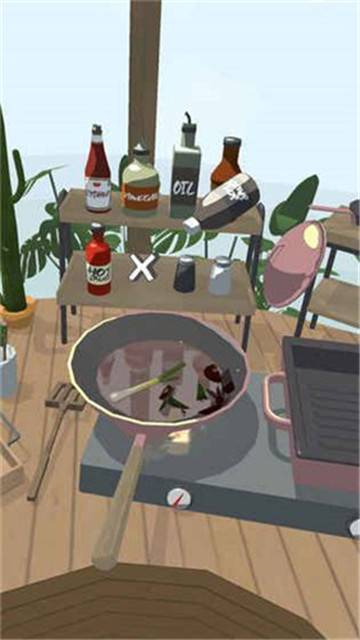2、点击食材,它们会落在砧板上,点击刀具并对齐食材以完成切割动作。烹饪过程也是如此,点击开火或关火