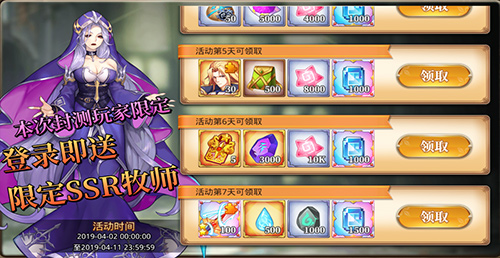 活动说明:仅限首次封测玩家,每天登录游戏即可领取限定版封测大礼包,多名SSR角色以及专属神器等你来拿!
