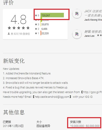 目前《Castle Clash》在GOOGLE平台上的表现十分惊人,从GP应用商店中的数据显示该作的5星评价已经超过了72W次,并且下载量已经在一千万到五千万的区间内,同时被推荐次数超过40W次。