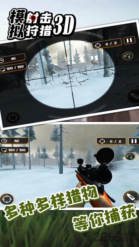 模拟射击狩猎3d最新版是一款射击题材的手机狩猎游戏,游戏画面精致,背景音效逼真,游戏中玩家需要使用现有的武器,击败和捕捉目标猎物,非常的刺激有趣,喜欢的小伙伴来2265安卓网下载吧!