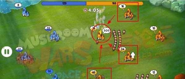 如果在场景中,建筑物头上冒出SOS的信息,那就证明该建筑物即将面临对方的侵略,所以,我们必须从最近的建筑物进行调配人手进行防御(操作方法:点击己方建筑物,拖动到需要支援的建筑物即可)