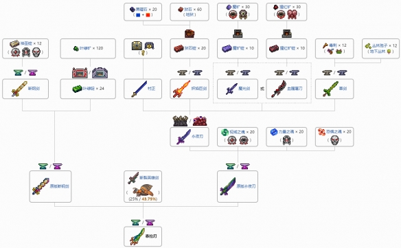 1、在前期能够获取到的物品有限,建议玩家在肉山之后就可以开始准备了,收集齐道具之后就可以依照下方合成方式就可以了。